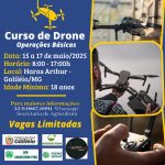 Curso de Drone – Operações básicas Data: 15 a 17 de Maio/2025 Horario: 08:00 as 17:00 h Local: Haras Artur- Galiléia Idade Minima: 16 anos Vagas Limitadas...