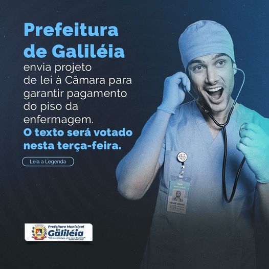A Prefeitura de Galiléia está trabalhando pela valorização dos nossos profissionais de saúde. Em atenção à Portaria nº 1.135 do Ministério da Saúde, que regulamenta os critérios e procedimentos para o repasse da assistência financeira complementar da União destinada ao cumprimento do piso salarial nacional de enfermeiros, técnicos e auxiliares de enfermagem, o Prefeito Juarez da Silva Lima, enviou à Câmara Municipal o Projeto de Lei (PL) para a abertura de crédito especial no orçamento vigente para pagamento do piso salarial nacional da categoria e para outras providências.